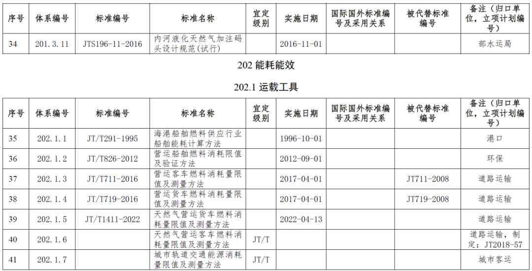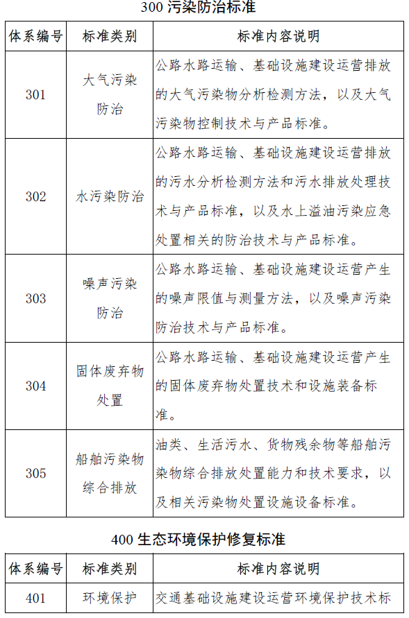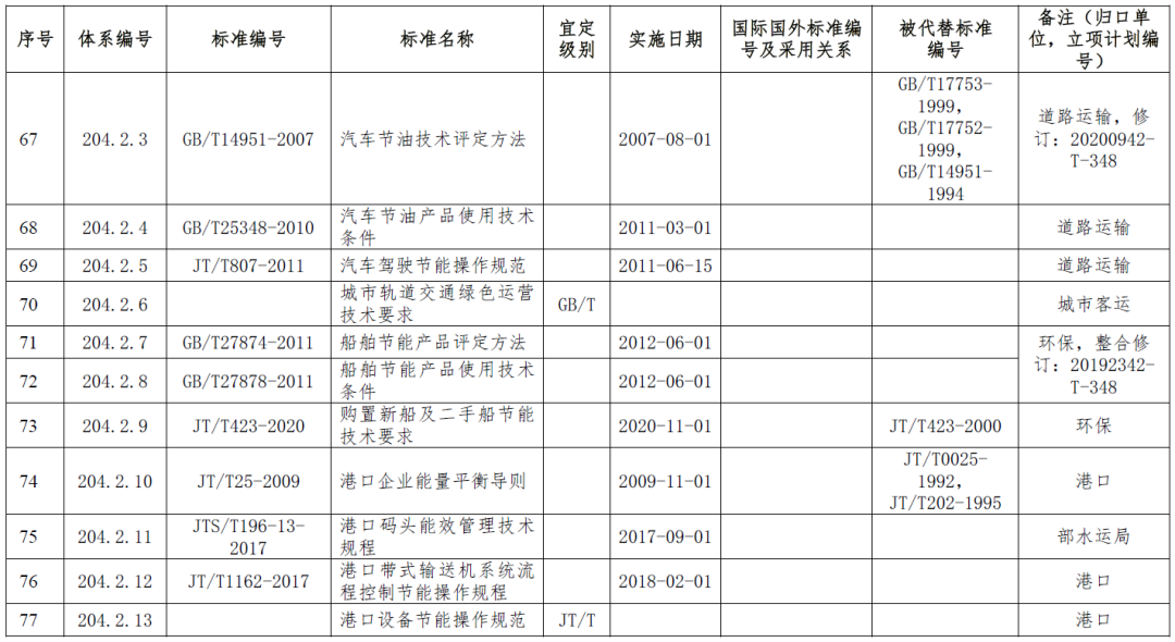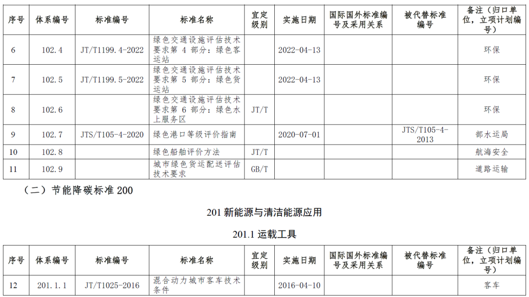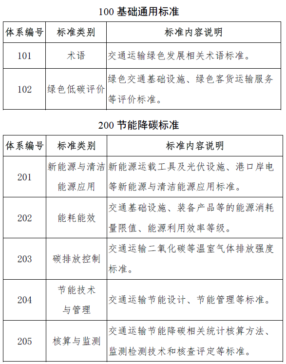 《绿色交通标准体系(2022年)》共收录242项绿色交通国家标准和行业标准,包括基础通用标准11项,节能降碳标准101项,污染防治标准78项,生态环境保护修复标准35项,资源节约集约利用标准17项。其中,待制定标准47项,待修订标准44项,包括了行业碳排放核算核查、近零碳交通示范区建设、城市绿色货运配送评估、氢燃料电池公共汽车配置、城市轨道交通绿色运营、水下打捞作业防污染技术等重点标准需求。此外,标准体系还列出了与交通运输行业节能降碳、污染物排放和生态环境保护密切相关的国家标准、生态环境行业标准43项,以促进绿色标准的协同实施。