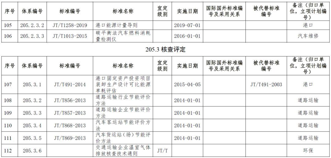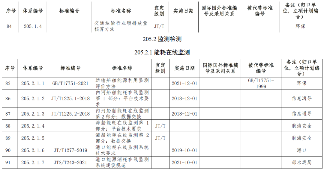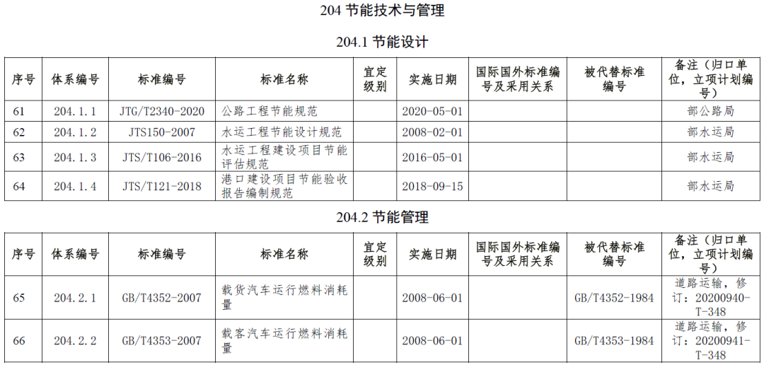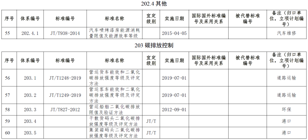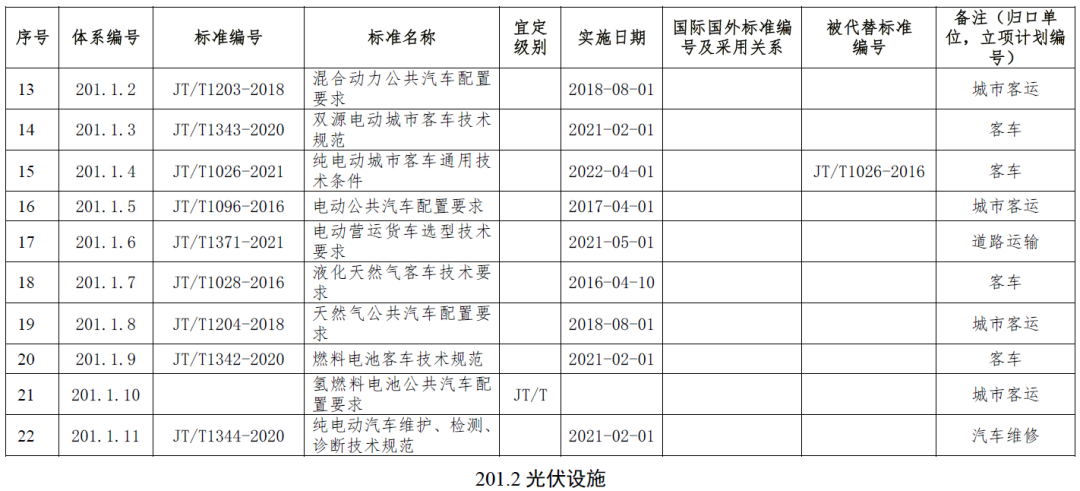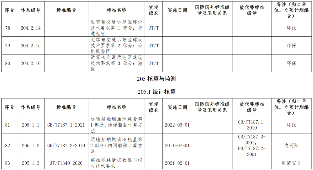 《绿色交通标准体系(2022年)》共收录242项绿色交通国家标准和行业标准,包括基础通用标准11项,节能降碳标准101项,污染防治标准78项,生态环境保护修复标准35项,资源节约集约利用标准17项。其中,待制定标准47项,待修订标准44项,包括了行业碳排放核算核查、近零碳交通示范区建设、城市绿色货运配送评估、氢燃料电池公共汽车配置、城市轨道交通绿色运营、水下打捞作业防污染技术等重点标准需求。此外,标准体系还列出了与交通运输行业节能降碳、污染物排放和生态环境保护密切相关的国家标准、生态环境行业标准43项,以促进绿色标准的协同实施。