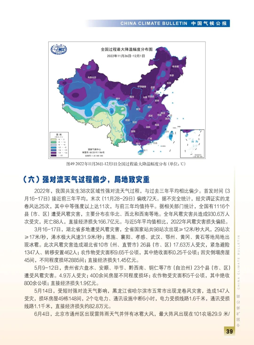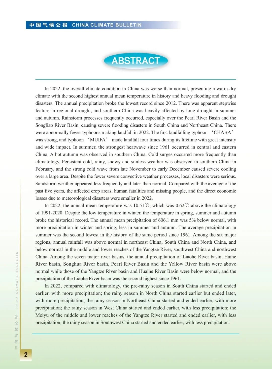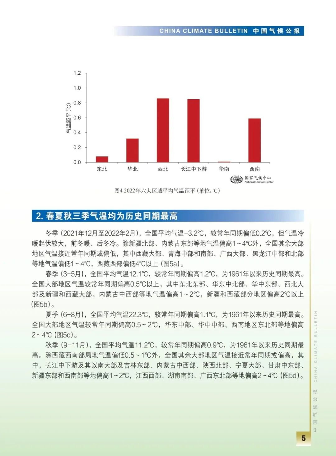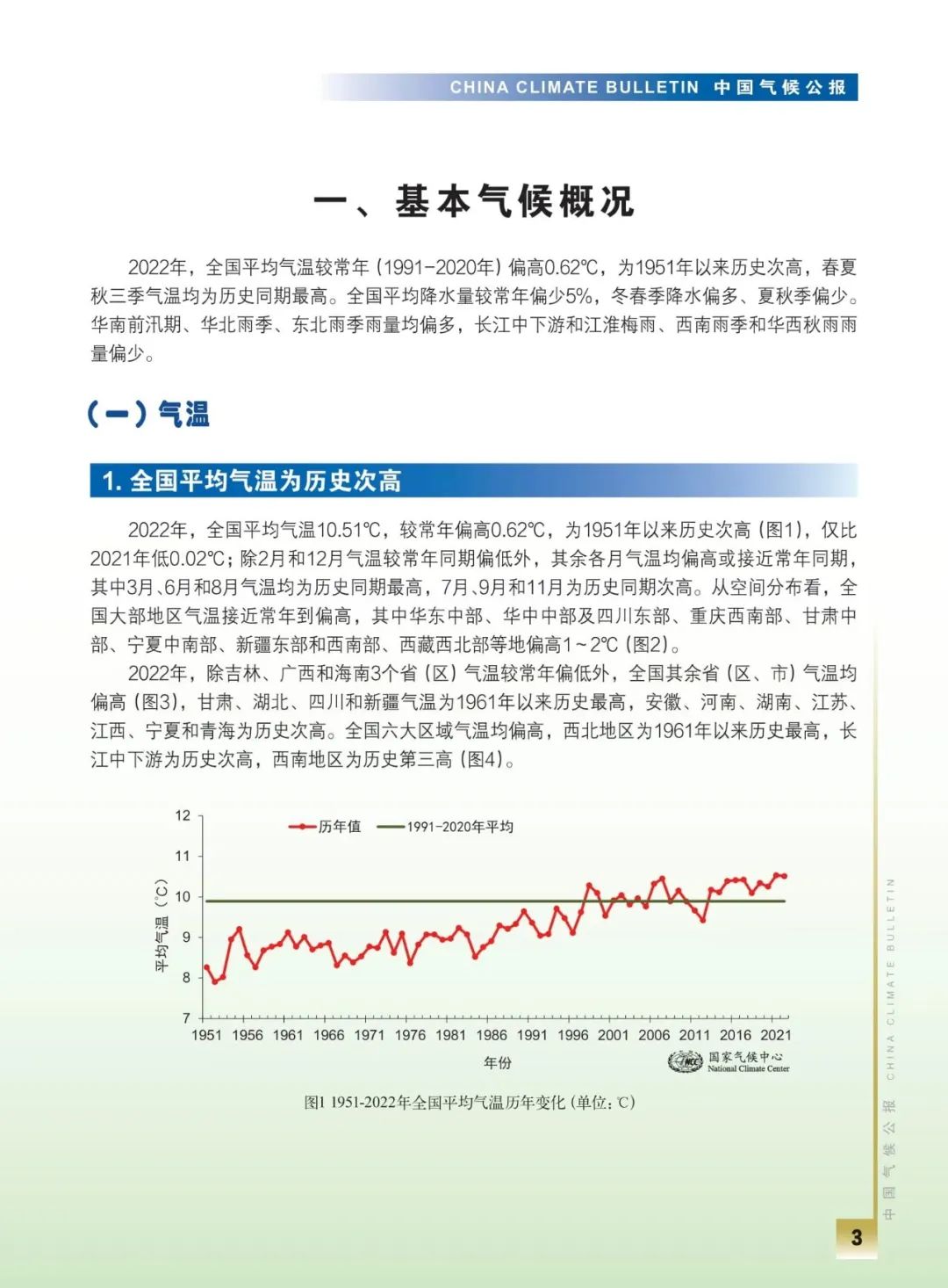 2月6日,在中国气象局召开的新闻发布会上,2022年度《中国气候公报》正式发布。这份由中国气象局国家气候中心完成的年度气候报告,全面分析了2022年中国基本气候概况、气候系统监测状况以及主要气象灾害和极端天气气候事件,综合评估了气候对行业、环境、人体健康等方面的影响。